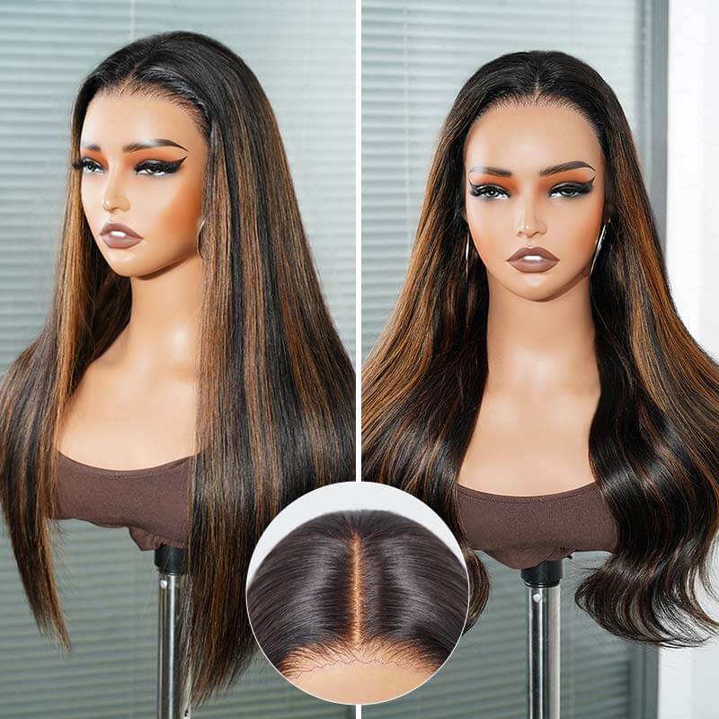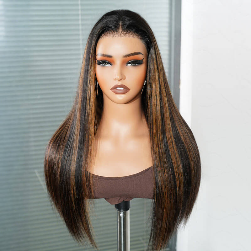 QVR Natural Hairline Brown Highlight Silky Straight Glueless 13x4 Pre-cut Lace Frontal Wig Human Hair
