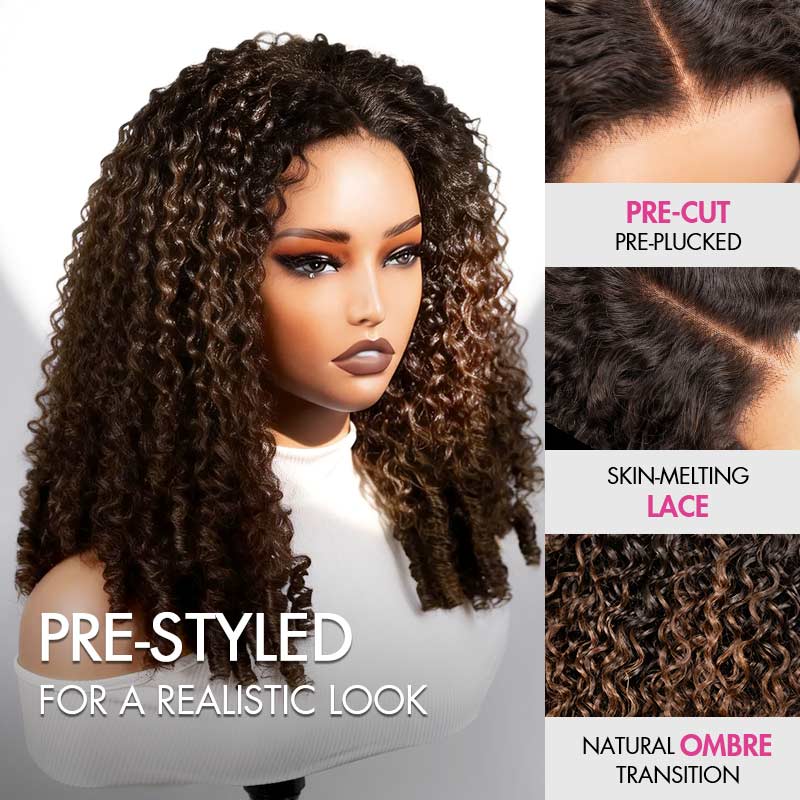 QVR Glueless Ombre Brown Blonde Kinky Curly Half Wig with Black Roots 250% Density Human Hair Wig #T1B/30/27 Wear Go Flip Over Wig