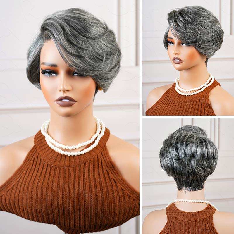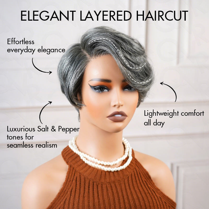 QVR Glueless Silver Grace Short Bob Wig Salt & Pepper Side-Swept Pixie Cut Wig Human Hair Wigs