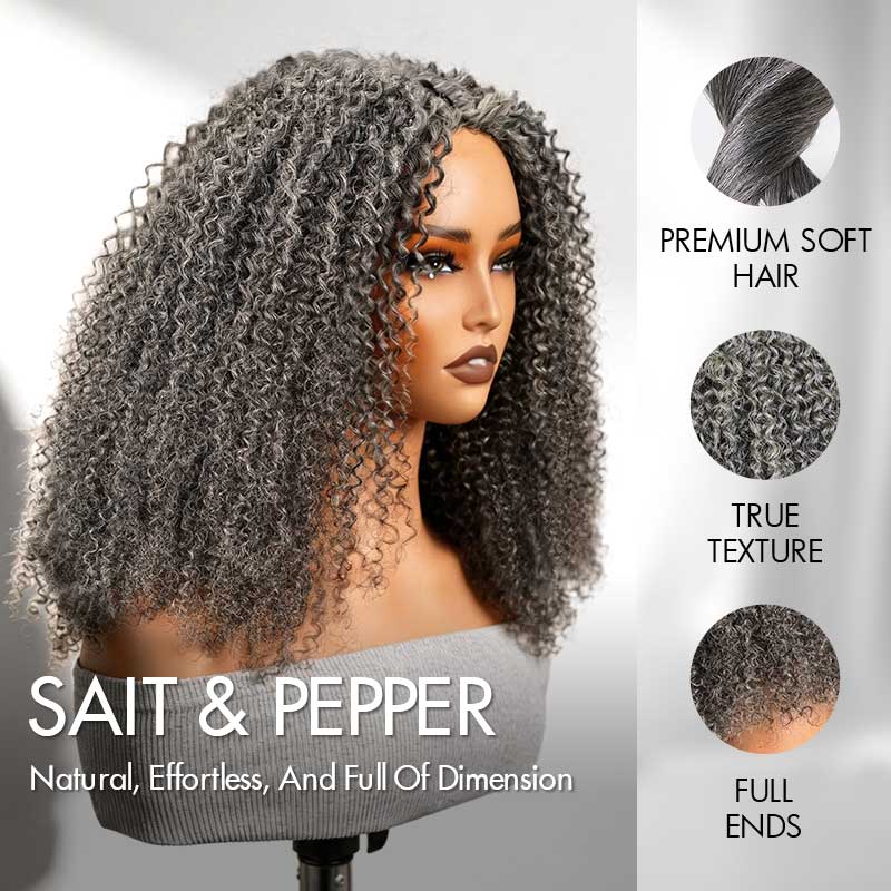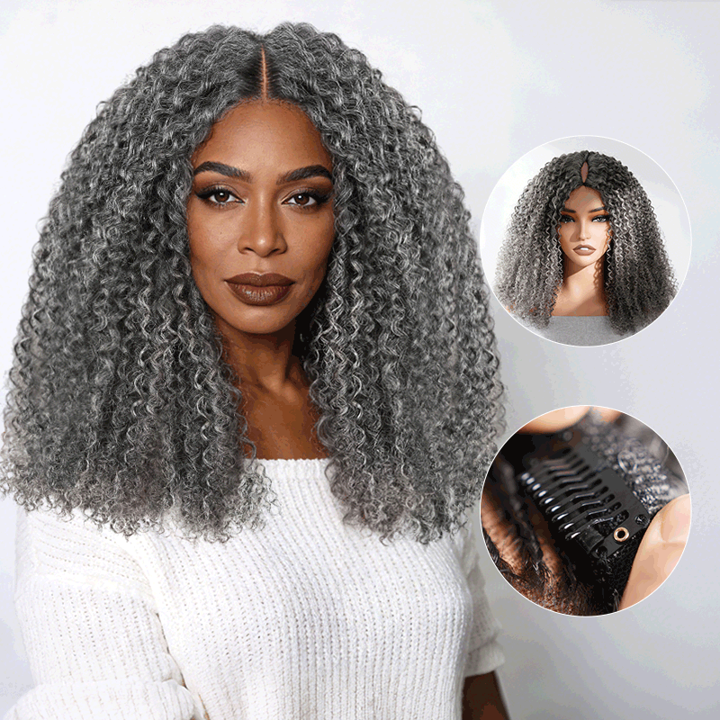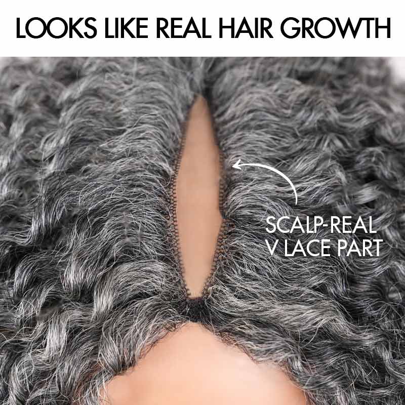 QVR Salt Pepper Kinky Curly V Part Wigs No Leave Out Invisible Lace Edge Human Hair Wig